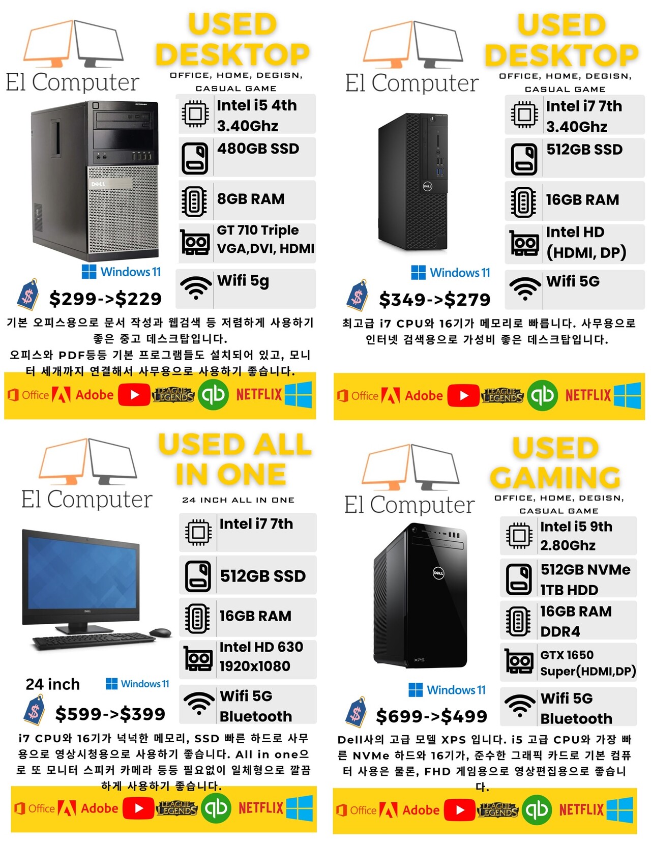 상태 좋은 중고(데스크탑, 올인원, 랩탑) 최저가로 판매합니다. 기본프로그램들, 영상, 사진 작업 프로그램들 다 설치되어 있고, 최적화 되어 있습니다.