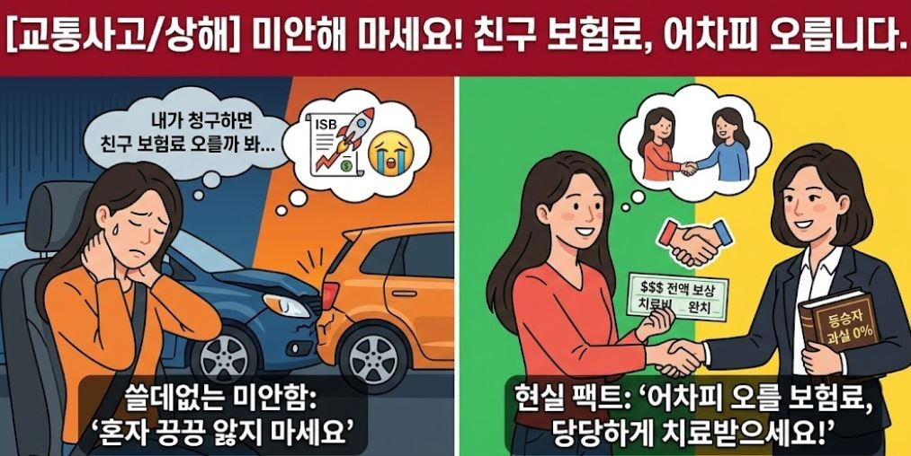 안녕하세요, 상해법 전문 최미수 변호사 법률 사무실입니다. 상담을 하다 보면, 지인의 차에 동승(Passenger)했다가 다치셨는데 미안함 때문에 억울하게 혼자 병원비를 감당하며 끙끙 앓는 분들이 정말 많습니다. 하지만 보험사 방어 변호사(Insurance Defense) 출신으로서 아주 냉정하고 현실적인 팩트를 말씀드립니다. "여러분이 청구하지 않으셔도, 어차피 친구의 보험료는 오릅니다. 절대 생돈 날리지 마세요.