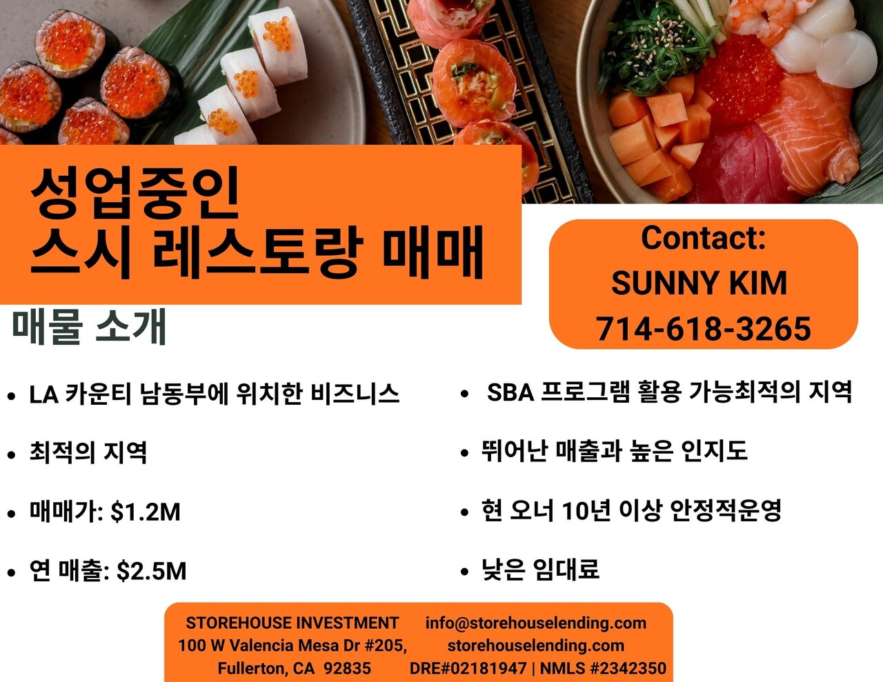 마켙에 나오지않은 매물, 오너가 10년이상 운영한 성업중인 스시 레스토랑 매매합니다.