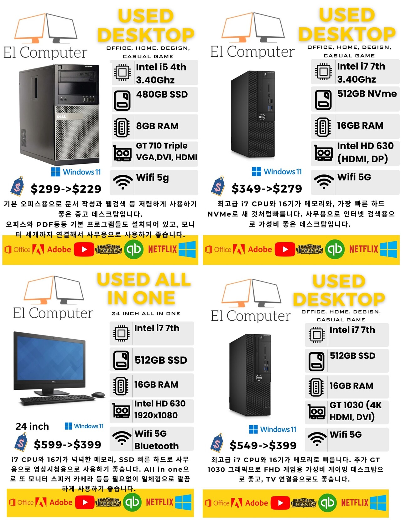 상태 좋은 중고(데스크탑, 올인원, 랩탑) 최저가로 판매합니다. 기본프로그램들, 영상, 사진 작업 프로그램들 다 설치되어 있고, 최적화 되어 있습니다.
