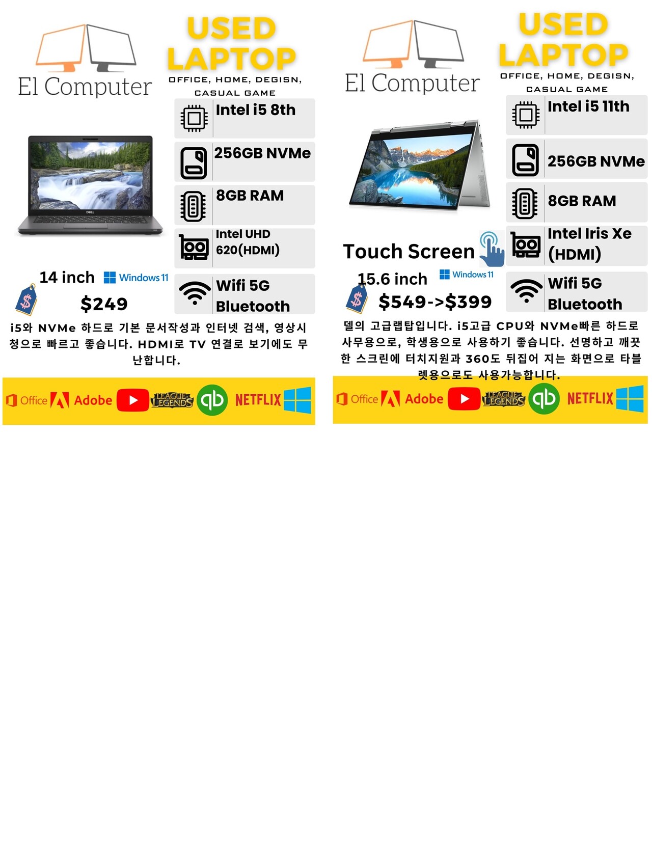 델의 고급랩탑입니다. i5고급 CPU와 NVMe빠른 하드로 사무용으로, 학생용으로 사용하기 좋습니다. 선명하고 깨끗한 스크린에 터치지원과 360도 뒤집어 지는 화면으로 타블렛용으로도 사용가능합니다.