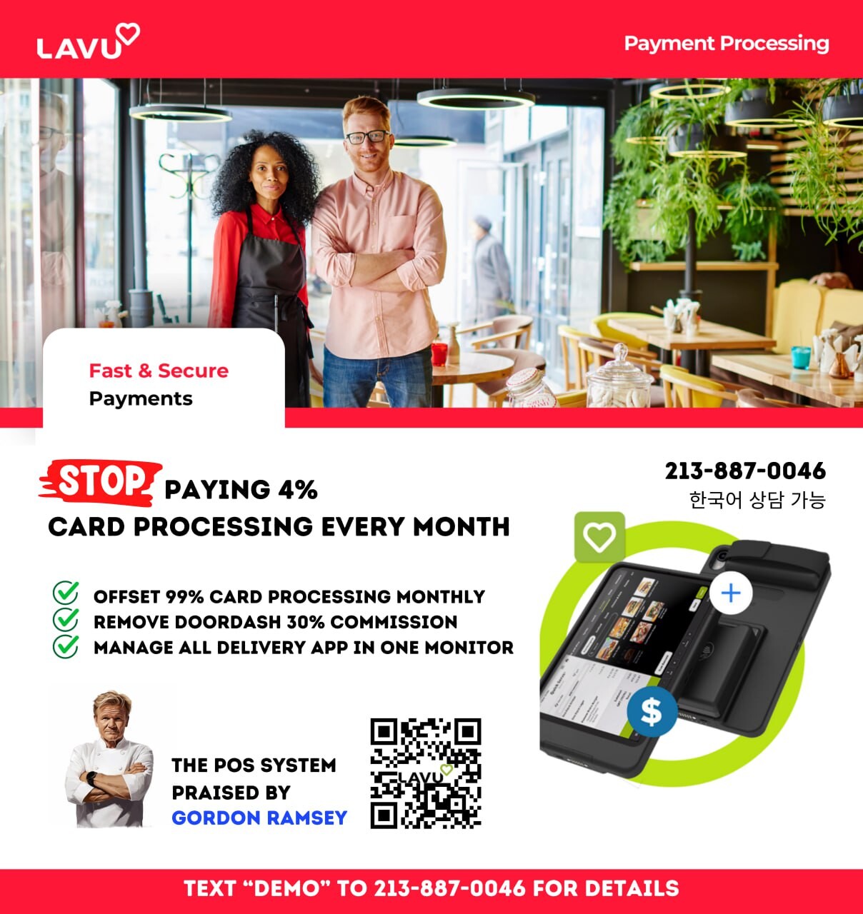 1. LAVU라는 POS(Point of Sales) 전문 회사에서 카드 수수료를 없애주는 단말기를 무료로 드립니다. (www.lavu.com)