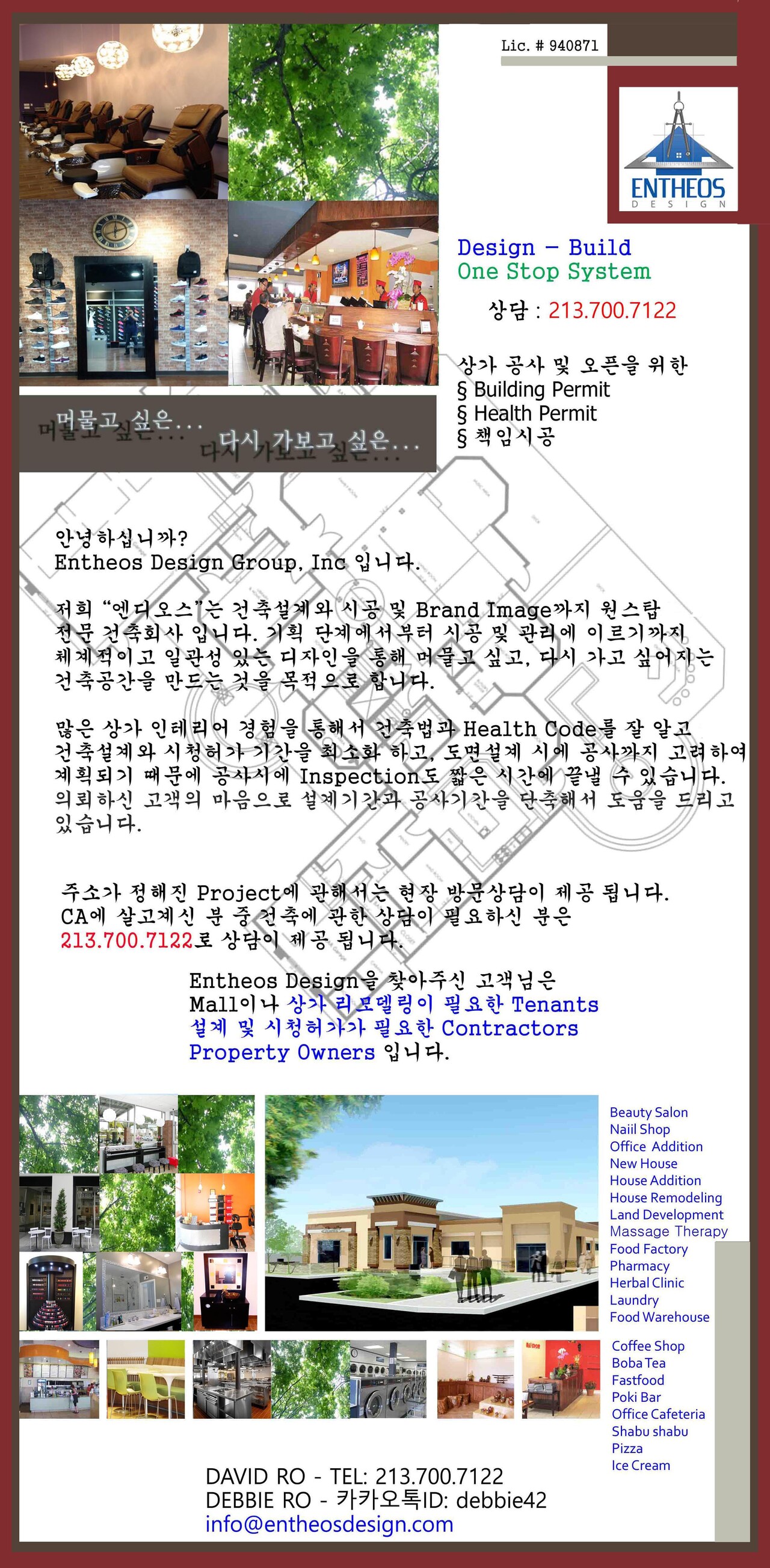 Entheos Design의 David입니다. 레스토랑 카페를 오픈하기 위한 Public Health Permit & Building