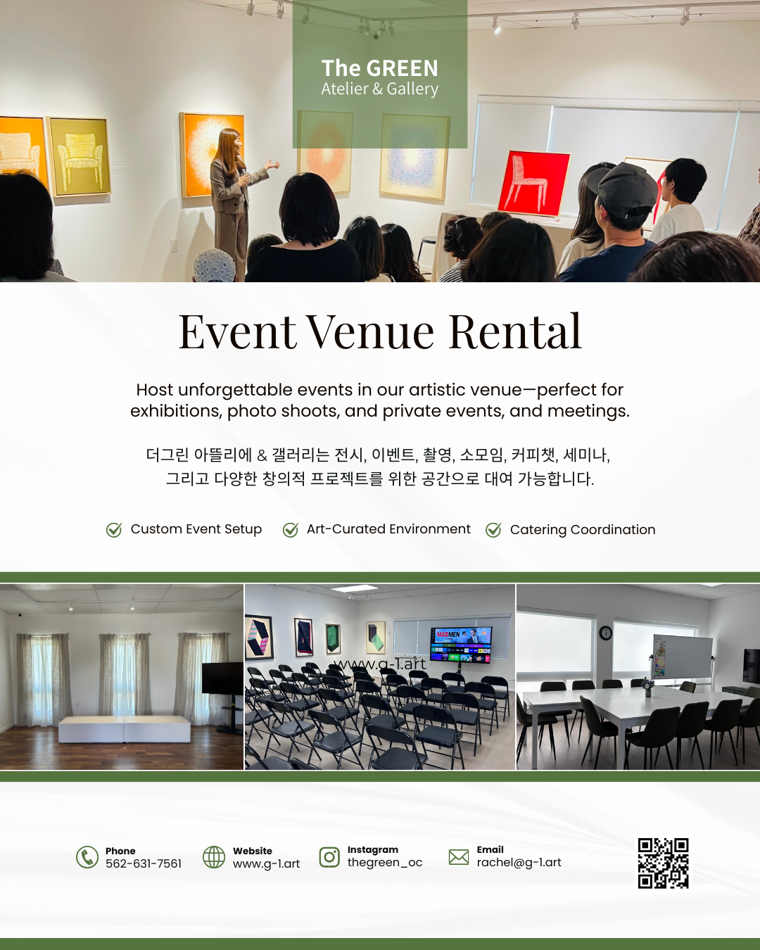 <The Green> 은 OC, Buena Park 소스몰 바로 옆에 위치한 복합 문화 예술 공간으로, 강의가 가능한 아뜰리에, 갤러리 그리고 Art Goods 전시장으로 구성되어 있습니다.