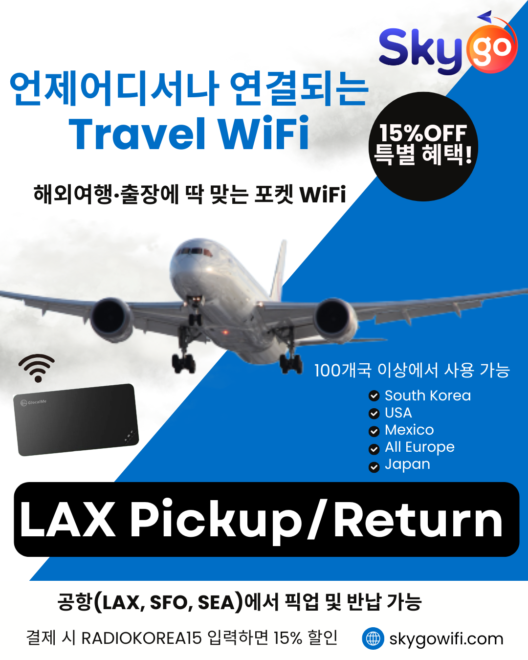 지금 SkyGo WiFi 렌탈 시 15% 할인 받으세요!