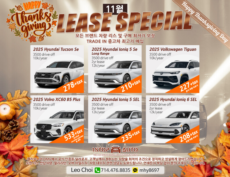 11월 추수 감사절 스페셜 모든 브랜드 차량 최저가 보장 중고차 최고가 LEO