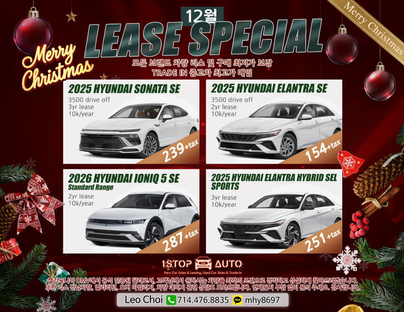 새해 맞이 스페셜 모든 브랜드 차량 리스 및구매 최저가 보장합니다! 714-476-8835