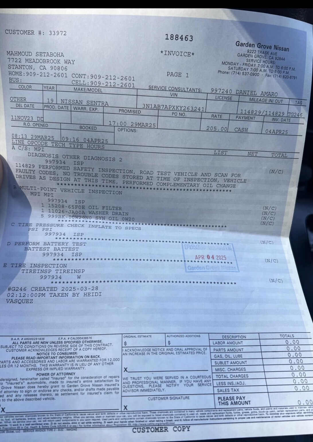 Nissan 공식 정비소에서 문제 없음을 확인했습니다. (사진 확인)