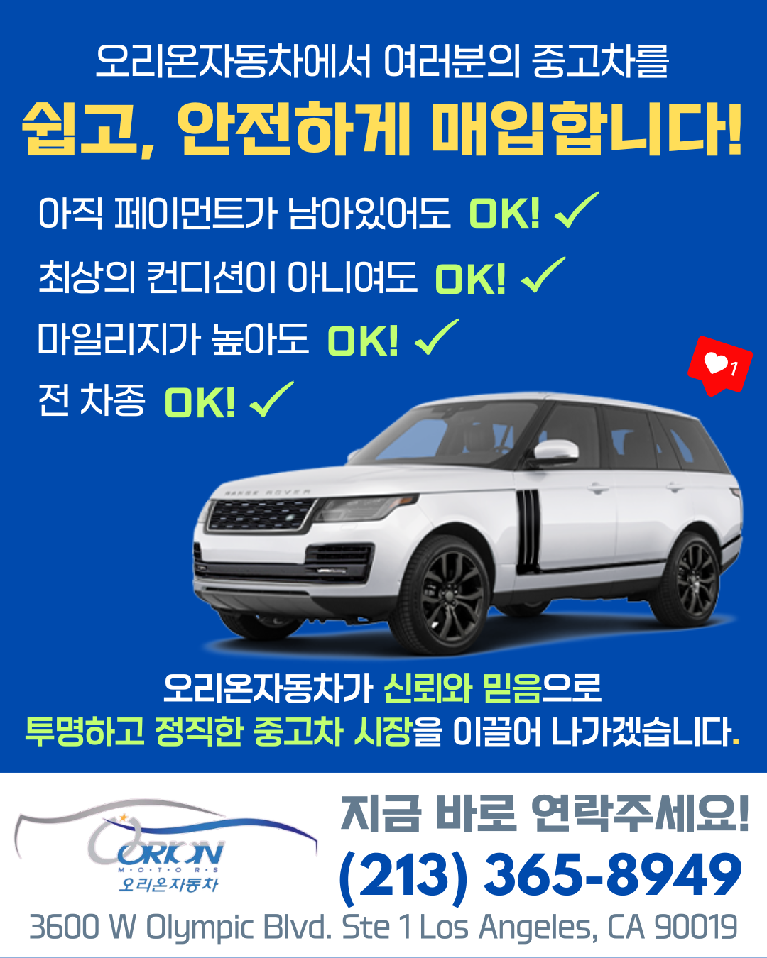 안녕하세요! LA 한인타운 올림픽 길에 위치한 오리온자동차 입니다.