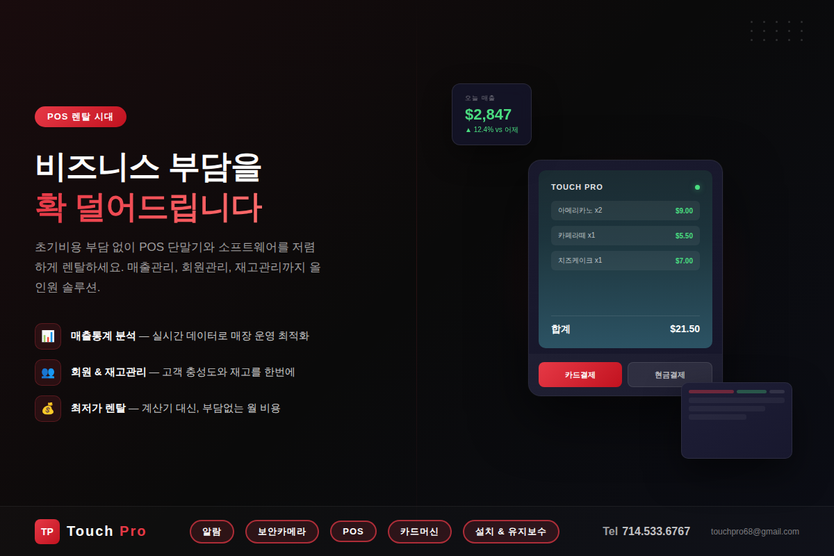 키오스크, 기프트카드, 무선카드단말기, 클로버 시스템, 온라인오더, 통합형 딜리버리 오더 (Uber Eats, DoorDash 등등
