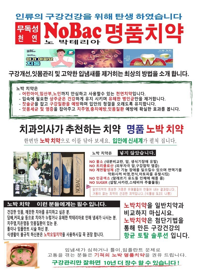 입냄새가 심하시거나 입안 문제로 고통을 격는 분들은 기적의 노박 오일을 꼭 한번이라도 경험 해보시기를 진정으로 권유 드립니다.