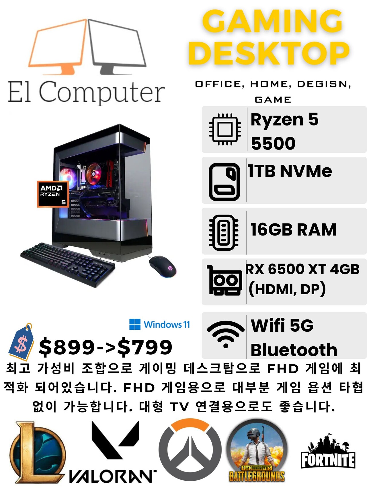 최고 가성비 조합으로 게이밍 데스크탑으로 FHD 게임에 최적화 되어있습니다. FHD 게임용으로 대부분 게임 욥션 타협없이 가능합니다. 대형 TV 연결용으로도 좋습니다.