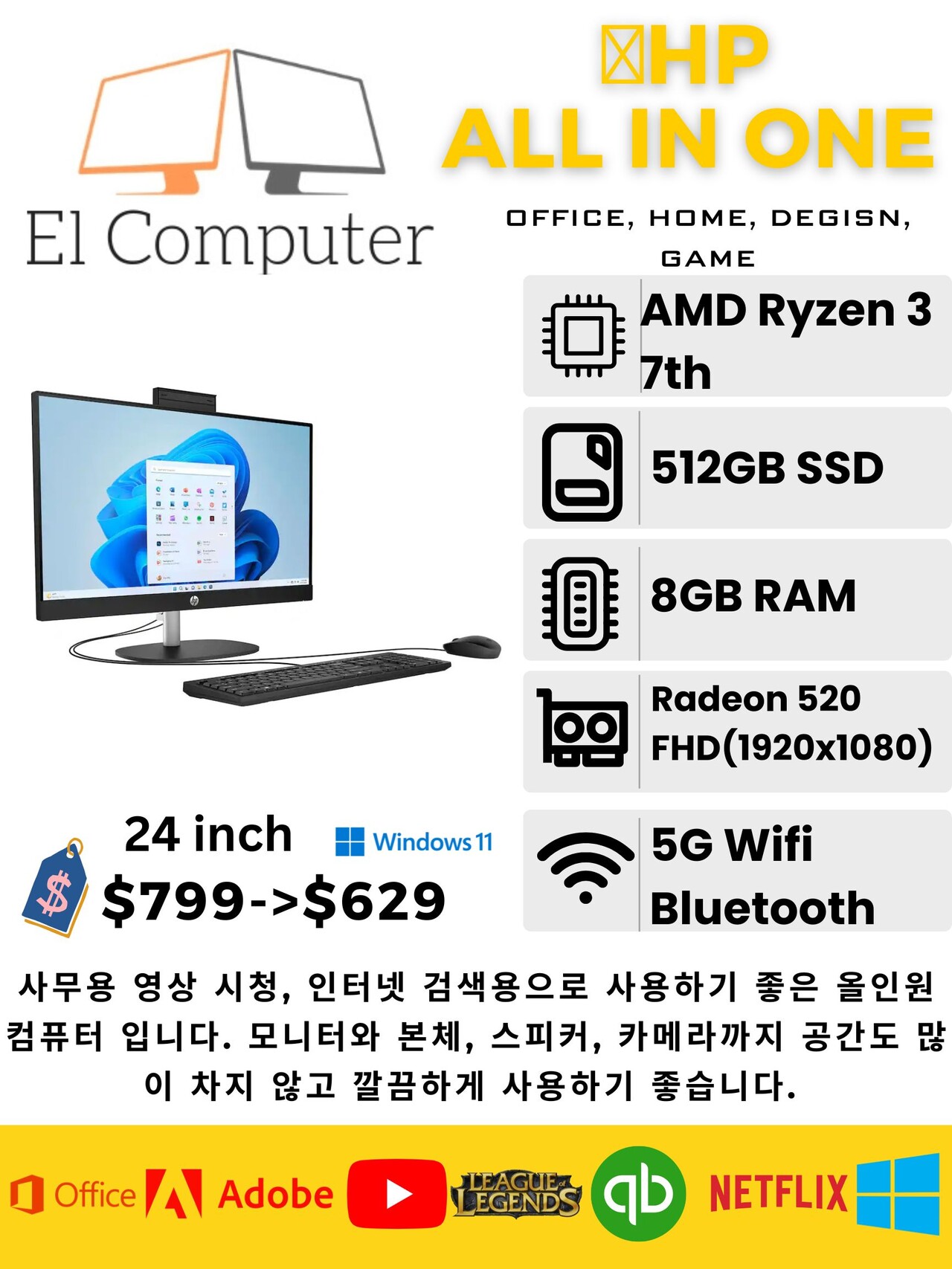 사무용 영상 시청, 인터넷 검색용으로 사용하기 좋은 올인원 컴퓨터 입니다. 모니터와 본체, 스피커, 카메라까지 공간도 많이 차지 않고 깔끔하게 사용하기 좋습니다.