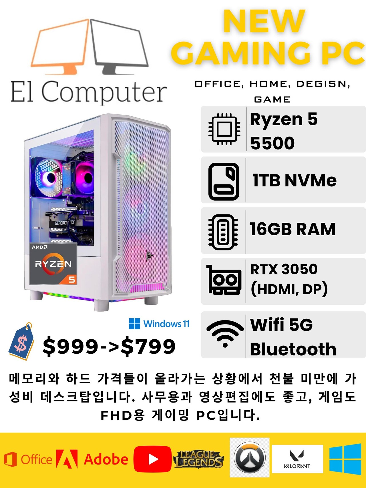 메모리와 하드 가격들이 올라가는 상황에서 천불 미만에 가성비 데스크탑입니다. 사무용과 영상편집에도 좋고, 게임도 FHD용 게이밍 PC입니다.