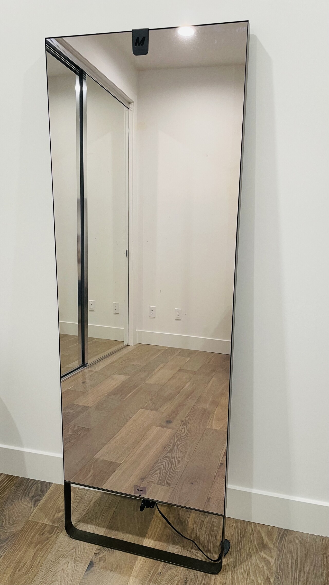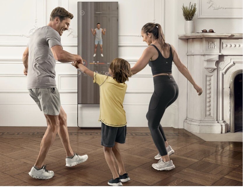 거울처럼 보이는 평평한 화면을 통해 다양한 운동 영상을 제공하며 월별 멤버쉽 구매하여 운동 콘텐츠 활용 가능.