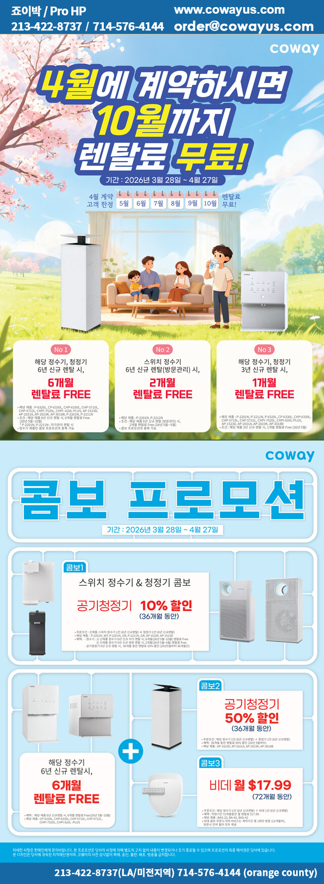 COWAY(정수기렌탈)-4월, 6개월 렌탈료 면제/청정기 36개월 50%할인/비데 $17.