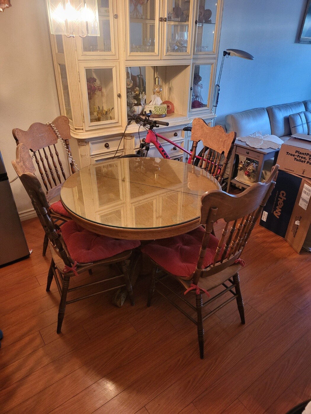 Set of Oak Round Dining Table with 4 Chairs and Glass
