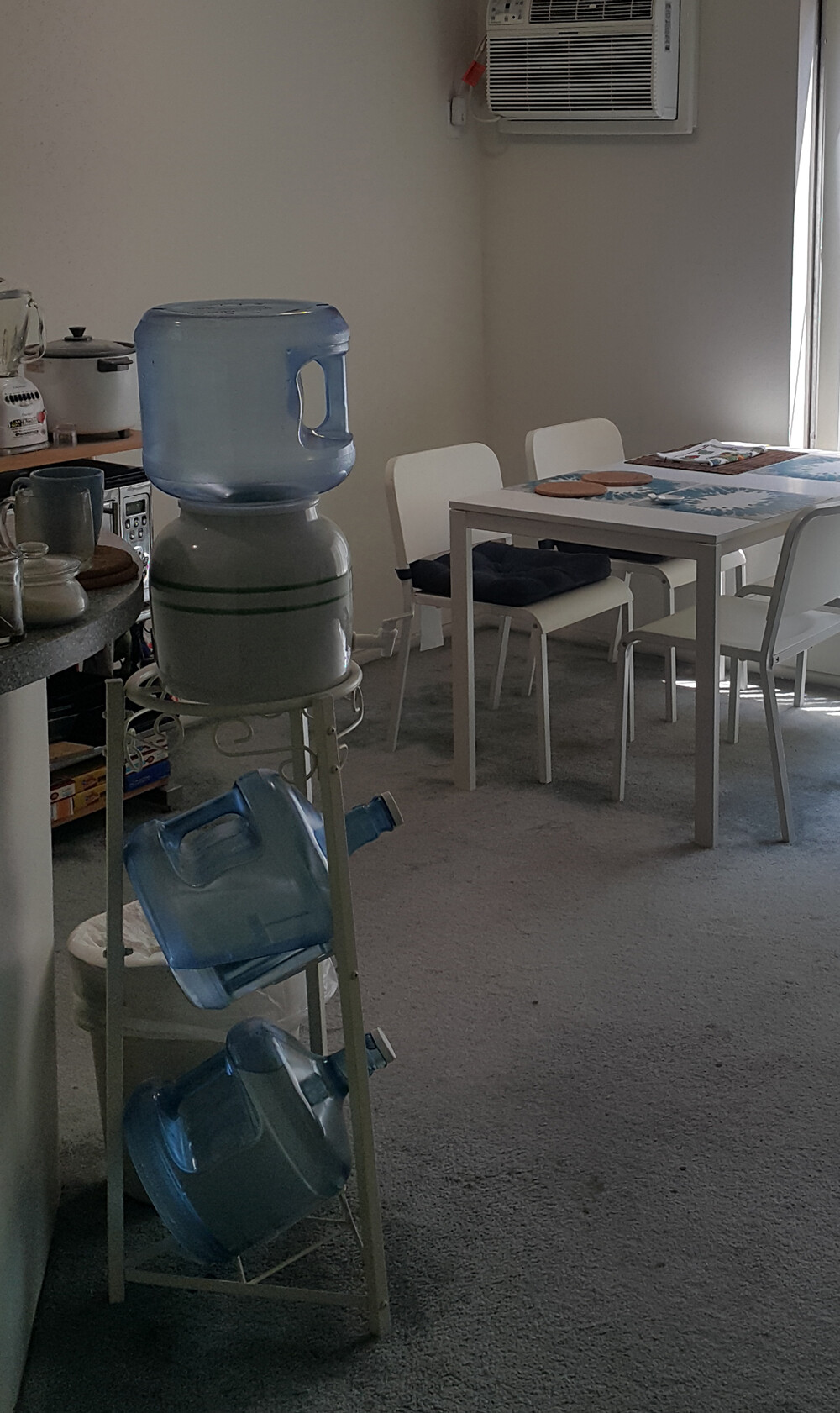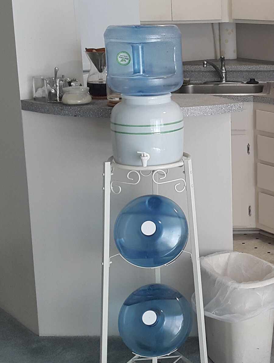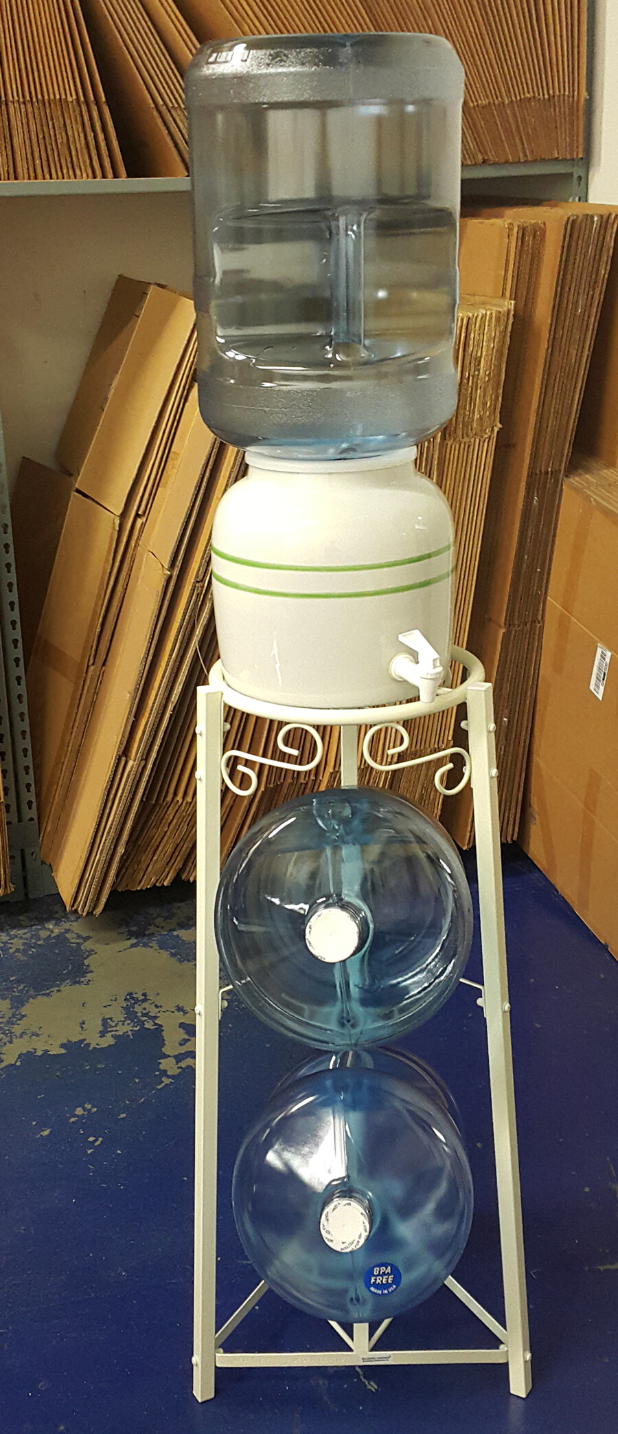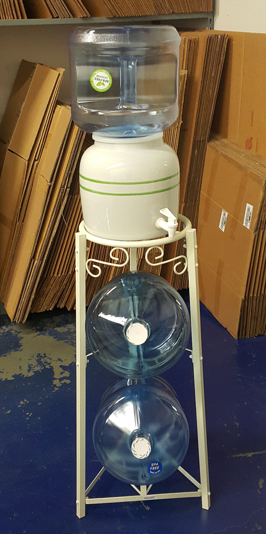 맨 위에 도자기로 된 식수통을 놓을 수 있고 그 밑에 식수통 2개를 예비로 거치해 놓을 수 있습니다. 3 갤런 5 갤런 식수통 사용 가능합니다. 오피스 홈 키친에서 사용 가능하며 예쁘고 스타일리쉬합니다.