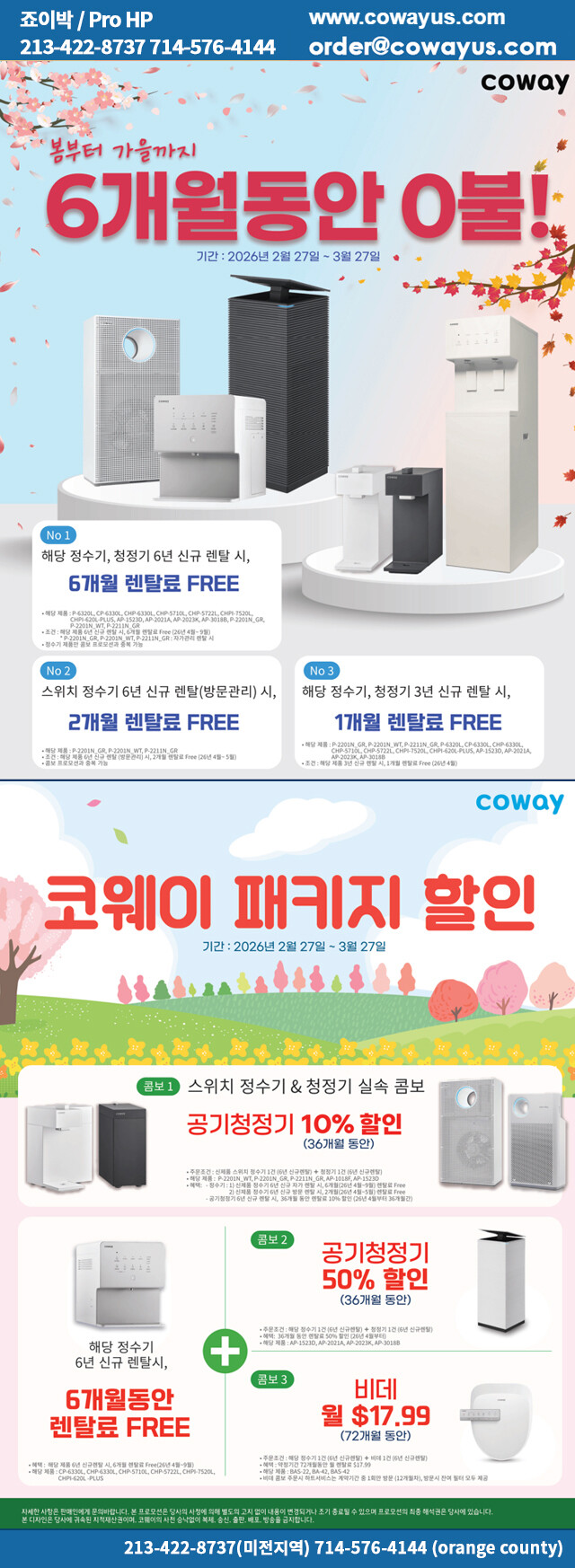 1. 자가관리 스위치정수기 + 해당 공기청정기 6년렌탈계약시-->정수기 6개월 면제 + 공기청정기 36개월 10%할인