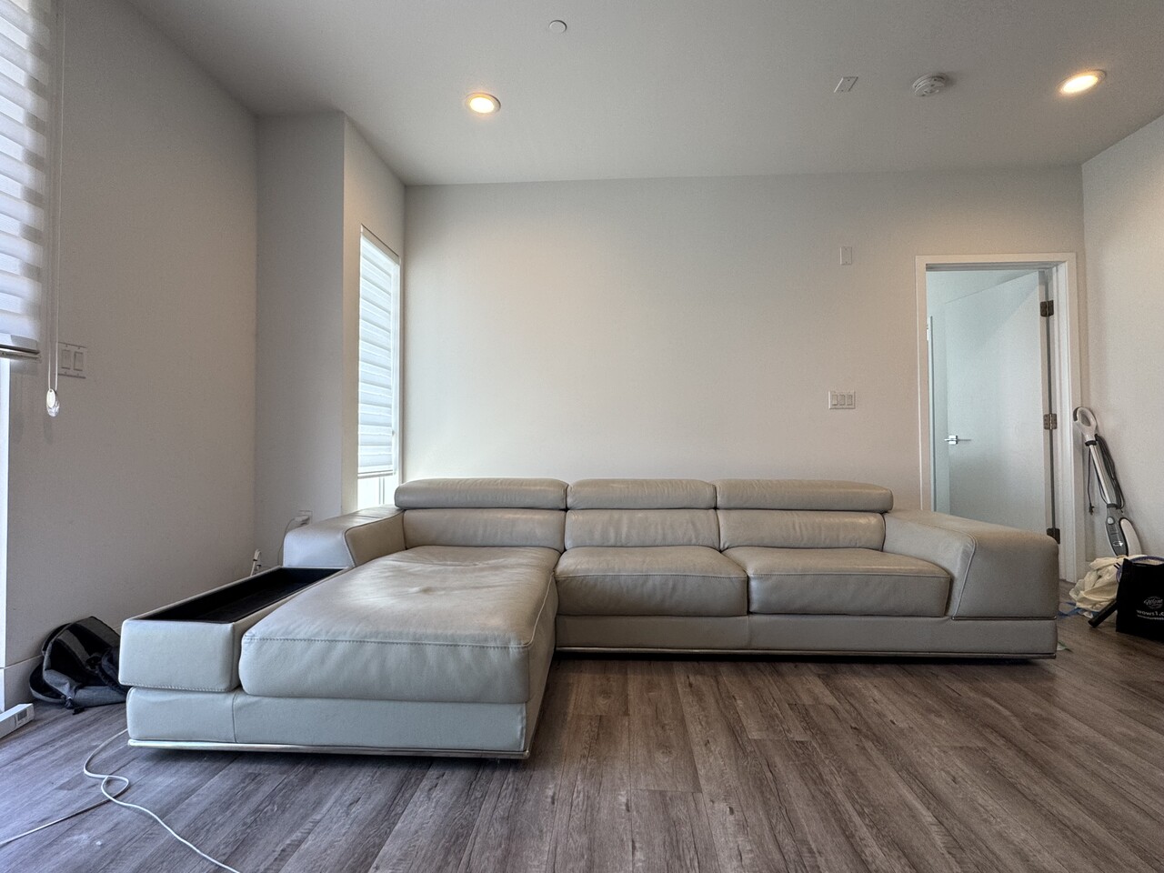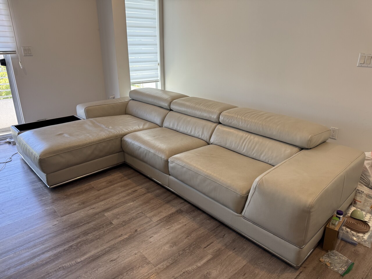Light gray sofa sectional made in italian leather from Modani. Has a console on the arm and has adjustable headrests. In good condition. pickup only. please refer to sectional on the modani site for similar measurements.