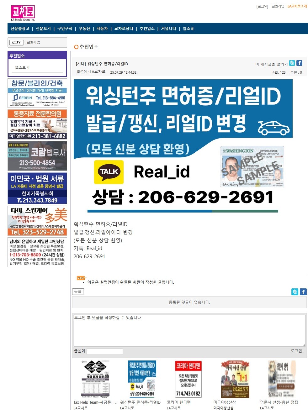 워싱톤주 리얼아이디/상담환영 (206)629-2691