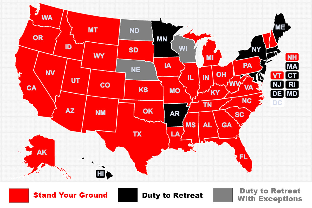 "자기 방어(Stand Your Ground)" 법은 개인이 법적으로 허용되는 장소에 있고 임박한 죽음이나 심각한 신체적 상해에 직면했다고 생각하는 한, 후퇴 의무 없이 합리적이고 치명적인 무력을 사용하여 자신을 방어할 수 있도록 허용합니다.