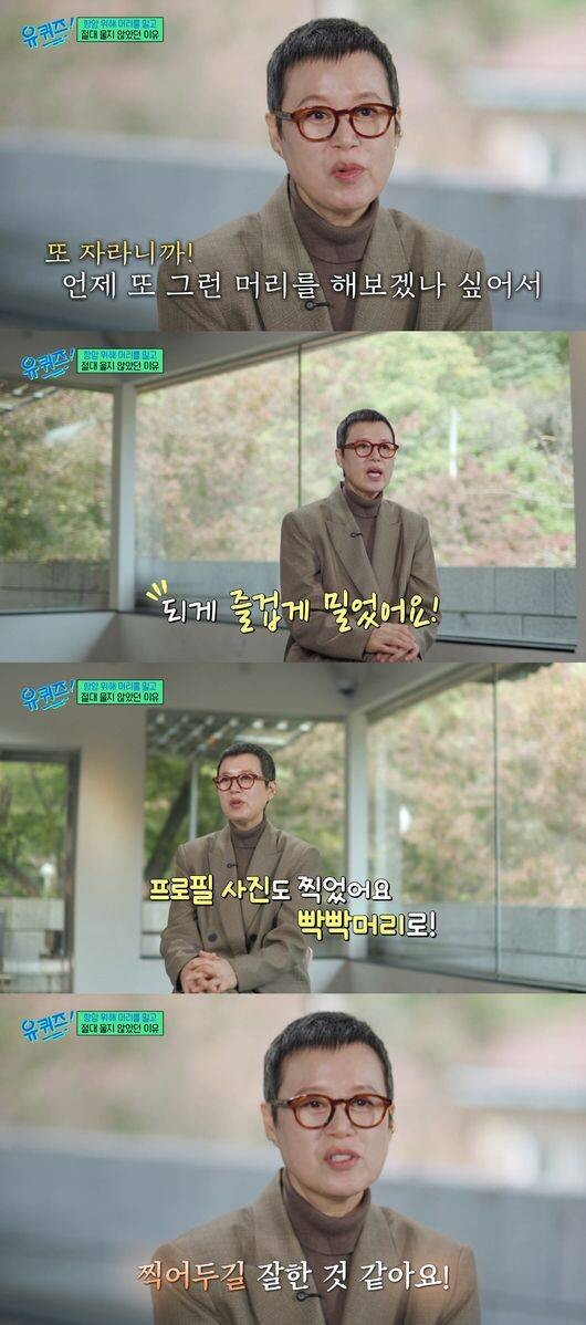 그러면서 "많은 여성분들이 머리카락 자를때 우신다고 하더라. 근데 또 자라니까. 그리고 언제 또 그런 머리를 해보겠나 싶어서 되게 즐겁게 (삭발) 했다. 프로필 사진도 찍었다. 빡빡머리로. '언제 또 이런거 해보겠어' 이러고. 물론 우리 딸이 하라고 해서 가긴 했는데 찍어두길 잘 한것 같다. 정장 입고 멋있게 찍었다"라고 만족감을 드러냈다.