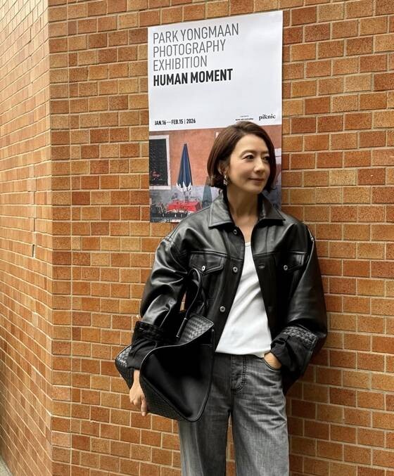 공개된 사진 속 김희애는 검은색 가죽 재킷에 청바지, 빅백으로 시크한 룩을 완성했다. 단발머리에 실버 이어링을 착용해 또렷한 이목구비를 강조하는 한편 뿔테 안경으로 '꾸안꾸' 매력을 선보였다.