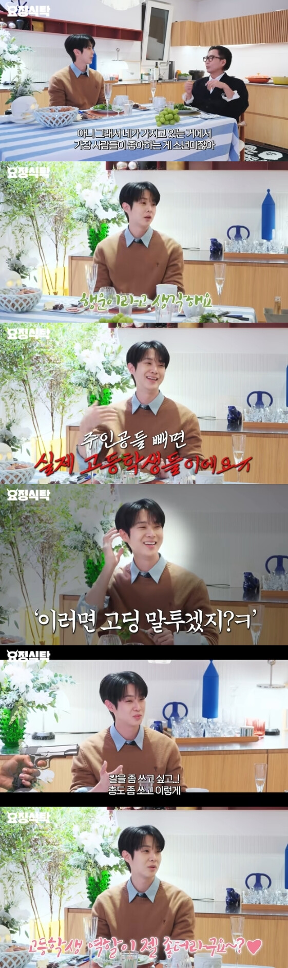 이어 "예전에는 고등학생 역할을 그만하고 싶을 때가 있었다. 나도 남자답고 피 냄새 나는 캐릭터, 칼을 좀 쓰고 싶고 총도 좀 쏘고 싶었다. 근데 살인자 역할도 해보니까 고등학생 역할이 제일 좋더라. 반에만 앉아 있으면 되니까"라고 설명해 현장을 폭소케 했다.