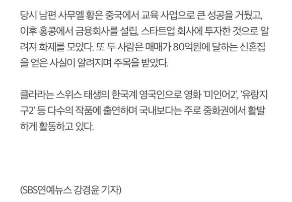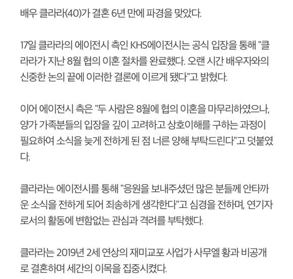 클라라, 결혼 6년 만에 파경사업가 사무엘 황과 `협의 이혼`