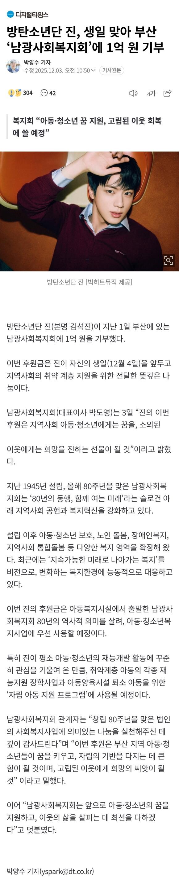 방탄소년단 진, 생일 맞아 남광사회복지회에 1억 원 기부