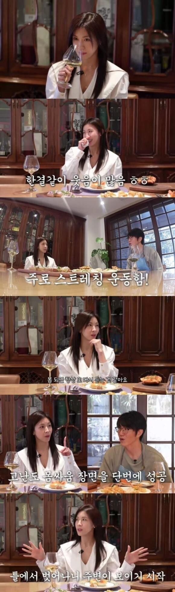 몸매 관리 비결에 대해서는 “주변에서 어떤 운동을 하는지 많이 물어보신다. 근육의 원리를 파악하며 스트레칭 운동에 집중한다. 자극이 필요한 포인트에 힘을 주고 내 몸과 대화를 나누는 것”이라고 설명했다. 이어 “꾸준히 쌓아온 운동 공력 덕분에 운동을 효율적으로 잘하게 된 것 같다”고 자신만의 노하우를 공개했다.