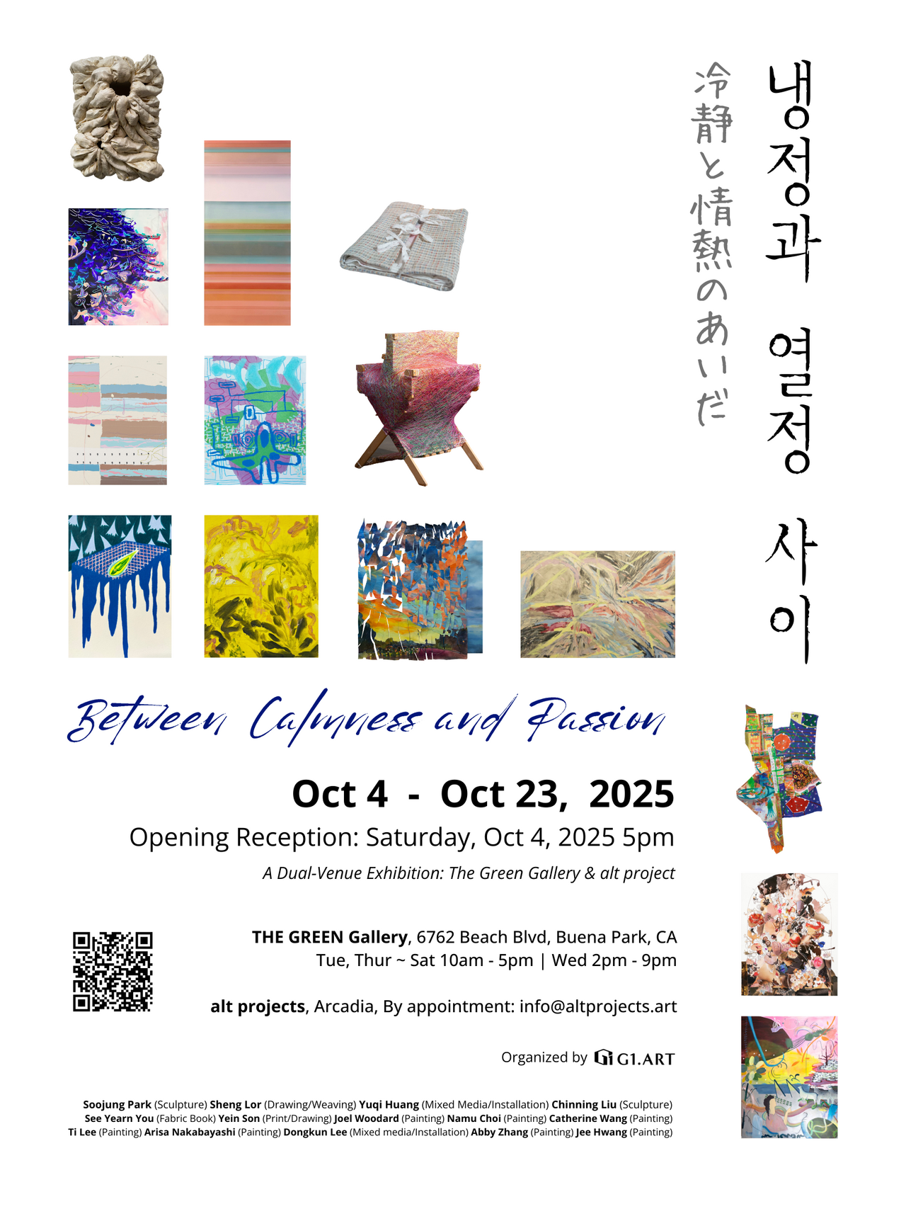 미국, 한국, 중국, 일본을 기반으로 활발히 활동하는 14인의 작가가 참여하는 그룹전, [냉정과 열정 사이 冷静と情熱のあいだ - Between Calmness and Passion]가 오는 10월 4일(토)부터 23일(목)까지 부에나 파크의 The Green Gallery와 아카디아의 alt projects에서 동시 개최됩니다.