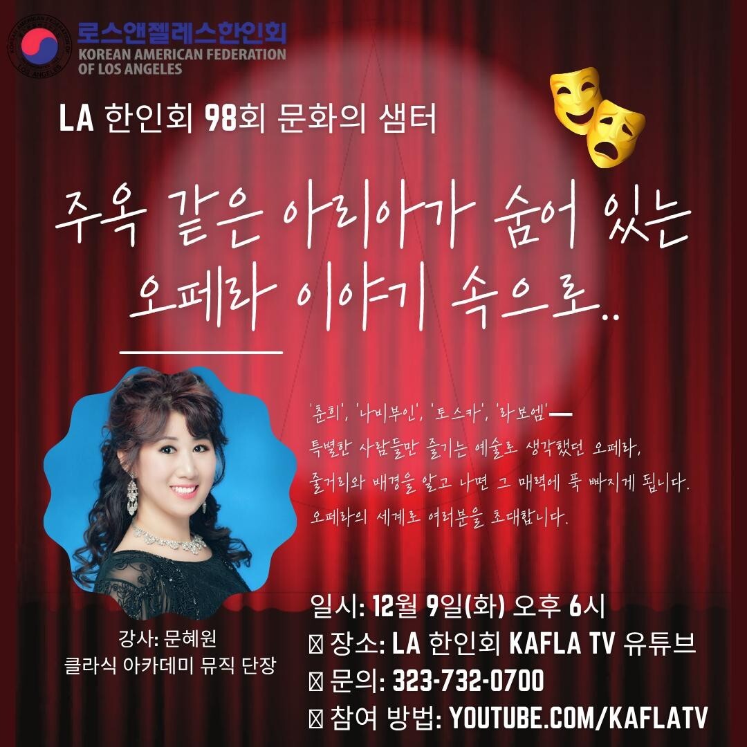 이러한 활동의 일환으로, LA 한인회(회장 로버트 안)는 오는 12월9일(화) 오후 6시에 제96회 ‘문화의 샘터온라인 강좌 “주옥 같은 아리아가 숨어 있는 오페라 이야기 속으로..”를 개최합니다.