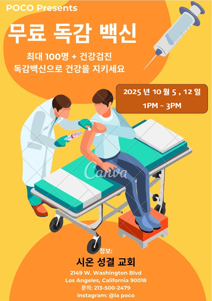 안녕하세요. 작년과 이어서, 올해 2025년도에도 시온 성결교회와 POCO foundation 에서 커뮤니티를 위해서 무료로 독감 예방 접종을 실시합니다. 보험이 있으신 분은 정보를 가져 오시면 좋구요. 보험이 없으셔도 무료로 봉사합니다. 예산의 이유로 100분만 간단히 예약을 받습니다. 주위에 필요한 분들께 알려주세요. 감사합니다. 접종은 10월 5일, 10월 12일에 하구요. 시간은 오후 1시에서 3시 사이입니다. 장소는 아래에 교회 주소가 있습니다. 혈압과 혈당도 체크해 드립니다.