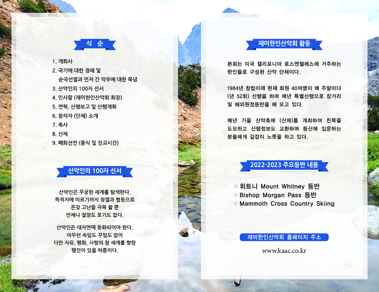 재미한인 산악회가 주관하는 제 40회 산악축제 초대장입니다. 누 구라도 오셔서 즐겨주시면 감사하겠습니다;