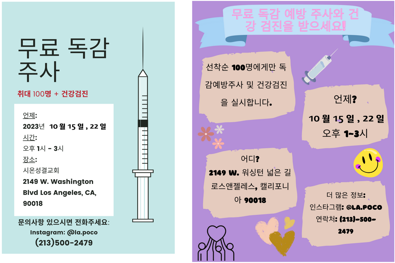 안녕하세요. 작년과 이어서, 올해 2023년도에도 시온 성결교회와 POCO foundation 에서 커뮤니티를 위해서 무료로 독감 예방 접종을 실시합니다. 보험이 있으신 분은 정보를 가져 오시면 좋구요. 보험이 없으셔도 무료로 봉사합니다. 예산의 이유로 100분만 간단히 예약을 받습니다. 주위에 필요한 분들께 알려주세요. 감사합니다. 접종은 10월 15일, 10월 22일에 하구요. 시간은 오후 1시에서 3시 사이입니다. 장소는 아래에 교회 주소가 있습니다. 혈압과 혈당도 체크해 드립니다.