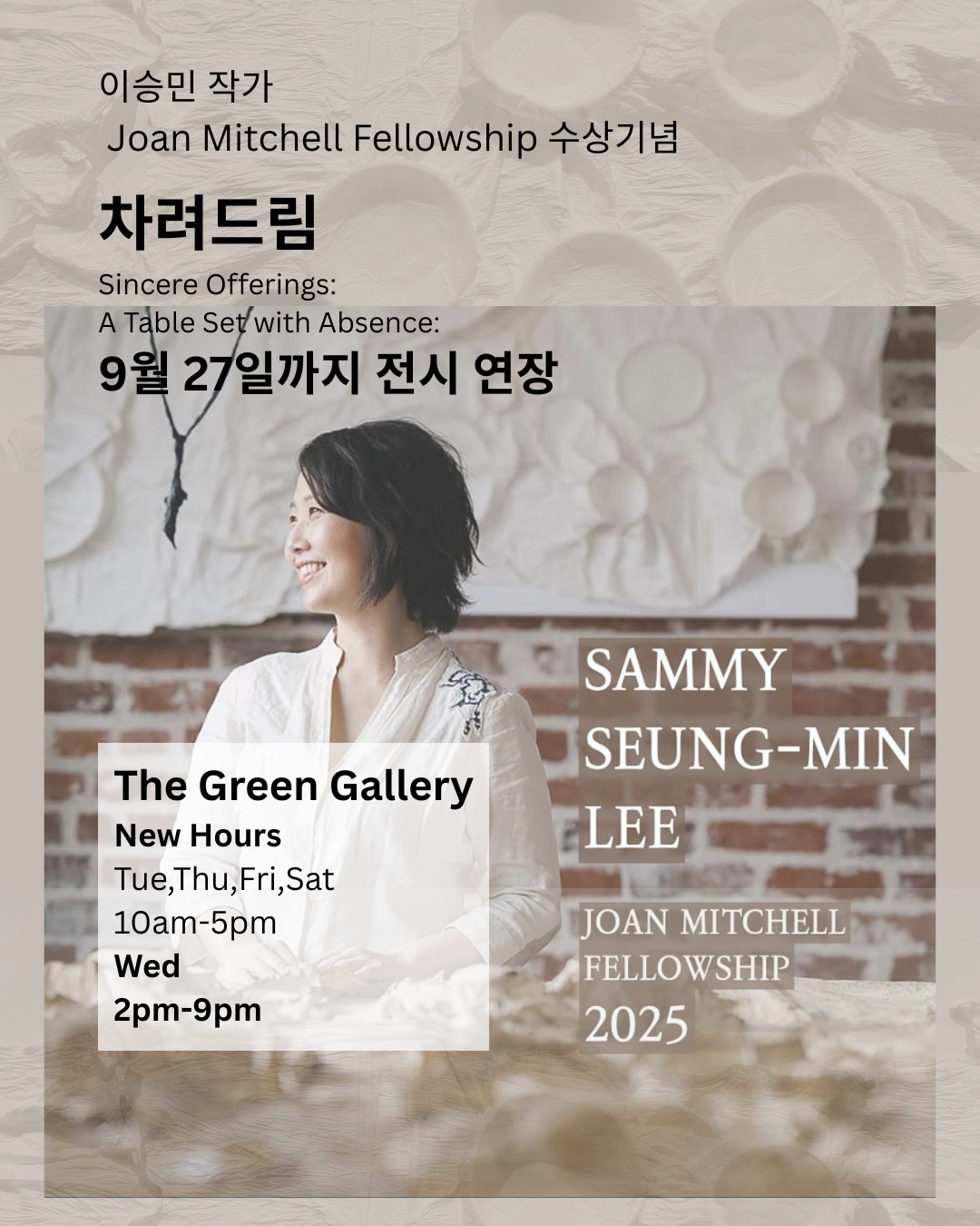 [더그린 갤러리]에서는 이승민 작가님의 수상을 축하하는 의미로 전시를 9월 27일까지 연장하기로 했습니다.