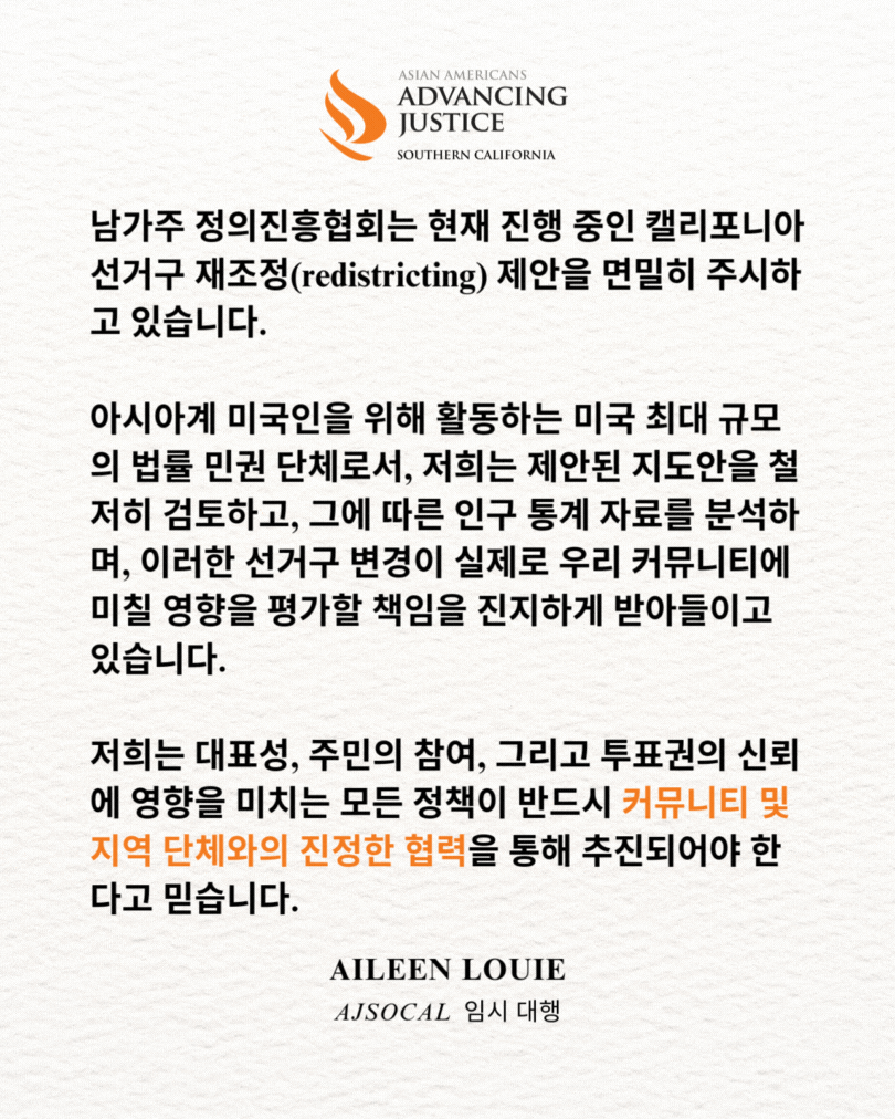AJSOCAL은 AAPI와 모든 커뮤니티가 공정하게 대표되는 선거구를 지지합니다.