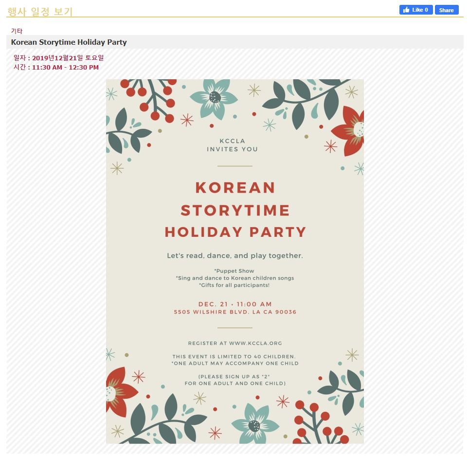 "Holiday Party" for children who are interested in Korean culture. There will be a puppet show about a Korean folktale, a mini Korean children's concert, and gifts!