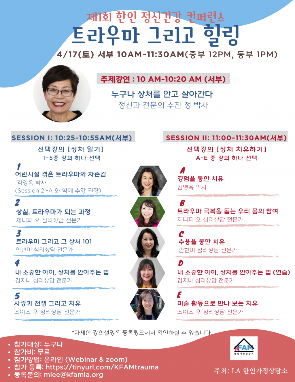 오는 4월 17일 컨퍼런스를 통해 상처를 극복하는데 도움 받으며 가족과 주위분들의 사랑을 통해 삶의 행복을 다시 누릴 수 있기 바라며, 토요일 1시간반만 내 자신을 돌보기 위한 투자를 해주시기 바랍니다.