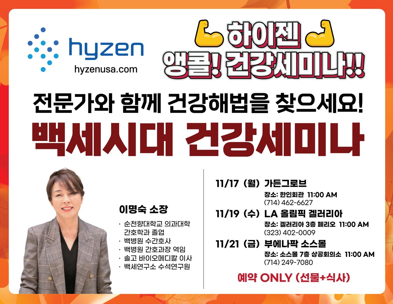 건강종합기업‘하이젠’(대표 임철호)이 남가주에서 11월 건강 세미나를 총 3차례에 걸쳐 마련합니다.