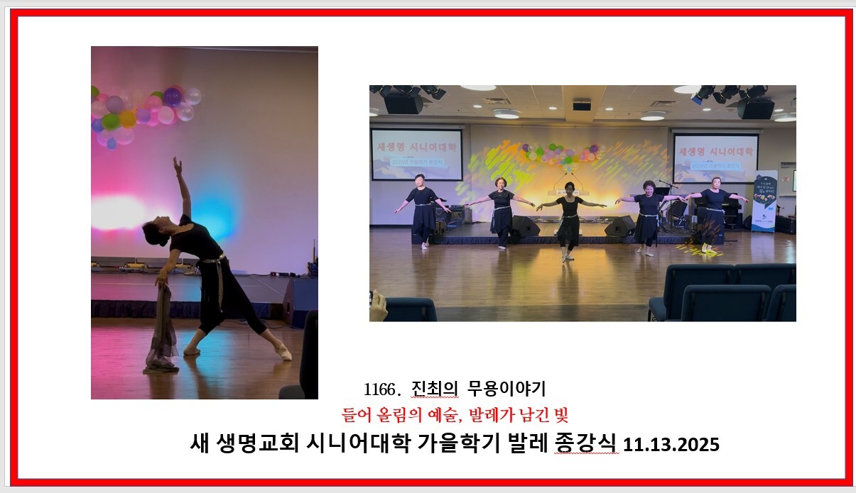 지난주, 새생명교회 시니어대학 가을학기 12주 발레클라스가 종강식 공연으로 마무리되었다. 새로운 무대는 늘 마음의 숨을 한 번 고르게 하는 자리다. 익숙한 일상에서 한 발 나오는 순간은 누구에게나 작은 용기의 떨림을 남긴다. 처음 수업을 시작하던 날, 많은 시니어분들이 “무대는 자신 없다”며 조심스레 물러섰던 이유도 아마 그런 마음의 떨림 때문이었을 것이다. 그러나 시간이 흐르자 그 마음은 천천히 열렸고, 12주가 지난 날에는 처음 망설였던 모든 분들이 스스로 무대에 서며 서로의 변화를 조용히 증명해 주었다.