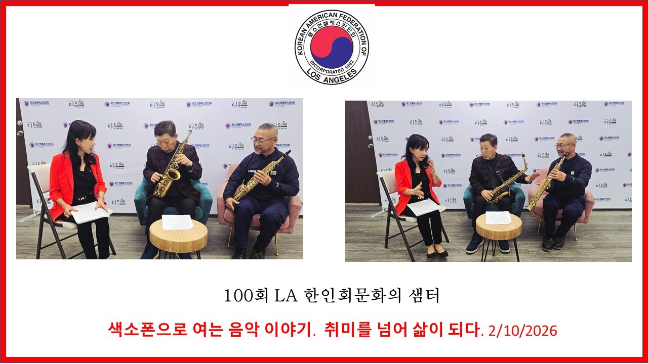 LA 한인회(회장 로버트 안)는 1962년 설립된 이후 지역사회와 함께 성장하며, 동포들의 권익 보호·교육·문화 진흥을 위해 다양한 프로그램을 지속해 왔습니다. ‘문화의 샘터’는 매달 둘째 주 화요일 열리는 대표 온라인 문화예술 강좌로, 지금까지 100회를 이어오며 한인사회의 문화적 역량을 높이는 중요한 역할을 해왔습니다.