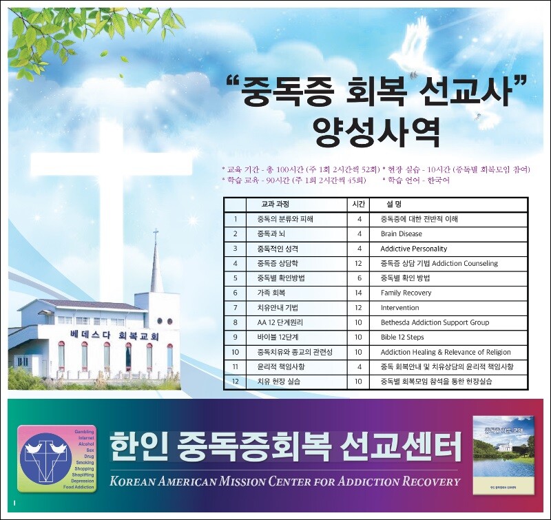 그래서 한인 중독증회복 선교센터에서는 지난 25년간 축적된 중독증 회복자료들과 치유안내 경험들을 토대로 “중독증 회복 선교사(Addiction recovery missionary)” 양성과정을 개설할 예정이다.