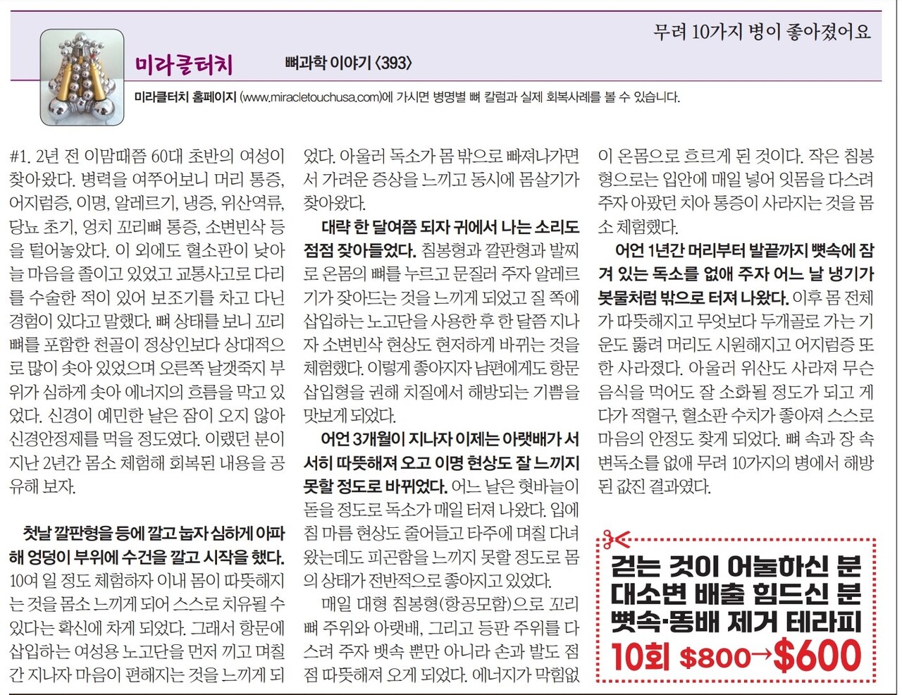 #1. 2년 전 이맘때쯤 60대 초반의 여성이 찾아왔다. 병력을 여쭈어보니 머리 통증, 어지럼증, 이명, 알레르기, 냉증, 위산역류, 당뇨 초기, 엉치 꼬리뼈 통증, 소변빈삭 등을 털어놓았다. 이 외에도 혈소판이 낮아 늘 마음을 졸이고 있었고 교통사고로 다리를 수술한 적이 있어 보조기를 차고 다닌 경험이 있다고 말했다. 뼈 상태를 보니 꼬리뼈를 포함한 천골이 정상인보다 상대적으로 많이 솟아 있었으며 오른쪽 날갯죽지 부위가 심하게 솟아 에너지의 흐름을 막고 있었다. 신경이 예민한 날은 잠이 오지 않아 신경안정제를 먹을 정도였다. 이랬던 분이 지난 2년간 몸소 체험해 회복된 내용을 공유해 보자.
