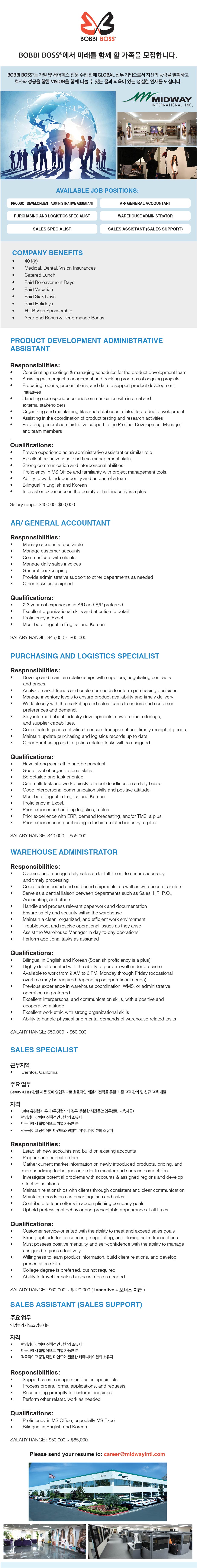 PRODUCT DEVELOPMENT ADMINISTRATIVE ASSISTANT, AR/GENERAL ACCOUNTANT, PURCHASING AND LOGISTICS SPECIALIST, WAREHOUSE ADMINISTRATOR, SALES SPECIALIST, SALES ASSISTANT (SALES SUPPORT)