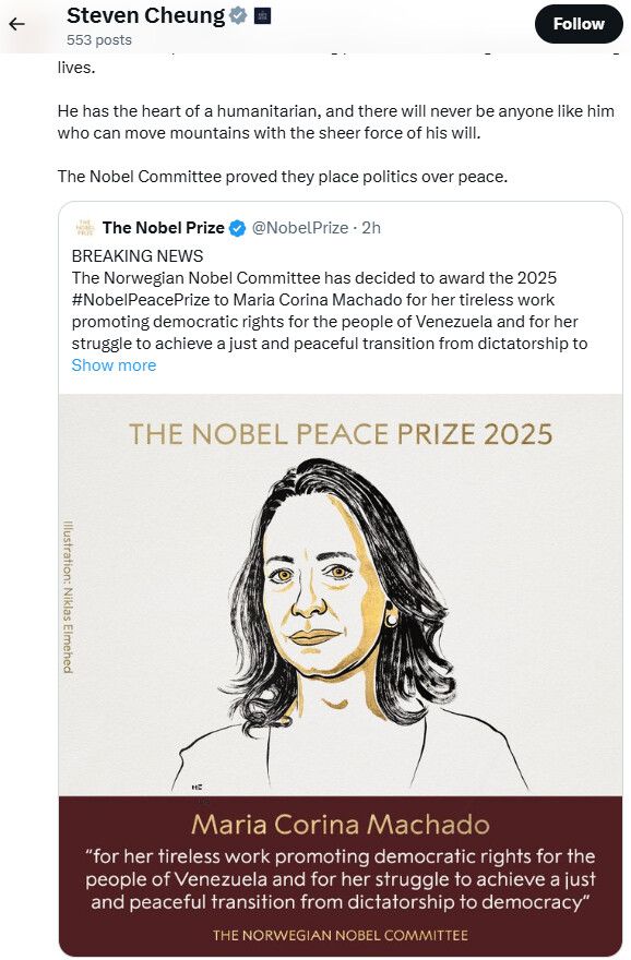 백악관, 트럼프 노벨평화상 불발에 "노벨위, 평화보다 정치우선"도널드 트럼프 대통령의 노벨평화상 수상이 불발되자 백악관은 "노벨위원회가 평화보다 정치를 우선시한다는 것을 입증했다"며 비난했다.스티븐 청 백악관 공보국장은 오늘(10일) X에 올린 …로컬|10.10.2025 04:51|라디오코리아