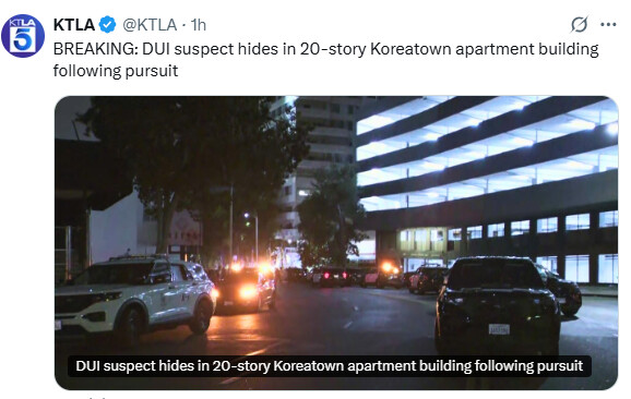 LA한인타운 추격전 용의자 2명 아파트 건물로 도주했다 체포오늘(10일) 이른 새벽 음주 운전 의심 차량에 타고 추격전을 벌이던 용의자 2명이 체포됐다.LAPD 노스이스트 디비전 경찰은 오늘(10일) 새벽 0시 18분쯤놀만디 애비뉴와 베벌리 블러바드 인근에…로컬|10.10.2025 06:48|라디오코리아