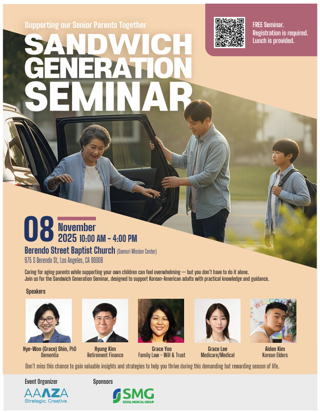 부모, 자녀를 부양해야하는 샌드위치 세대 한인 맞춤 세미나 개최LA한인타운에서 부모를 모시고 자녀를 양육해야하는 일명 샌드위치 세대에 속한 한인들을 위한 세미나가 열린다. AAAZA Inc.가 주최하고 SMG가 후원하는 이 세미나는 다음달(11월) 8일 오전 8…로컬|10.10.2025 11:15|라디오코리아